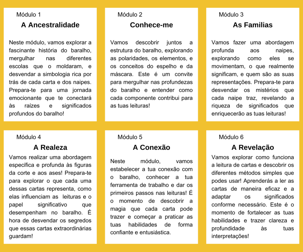 O objetivo deste curso é ajudar-te a deixar para trás a incerteza, a frustração e a ansiedade de não conseguir aprender esta arte. Com metodologia e acompanhamento, irás entender como o baralho funciona e como usá-lo de forma eficaz.